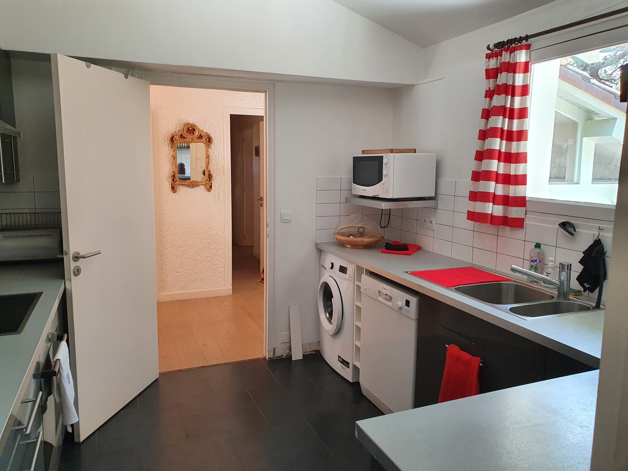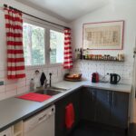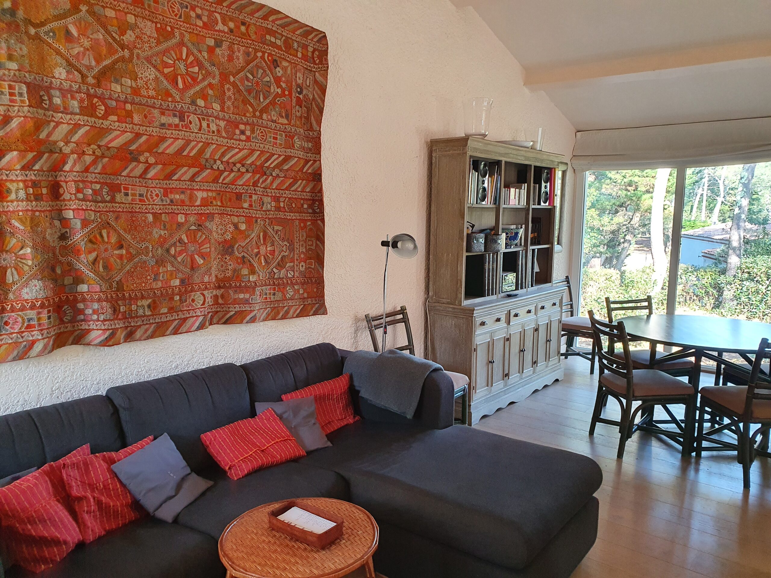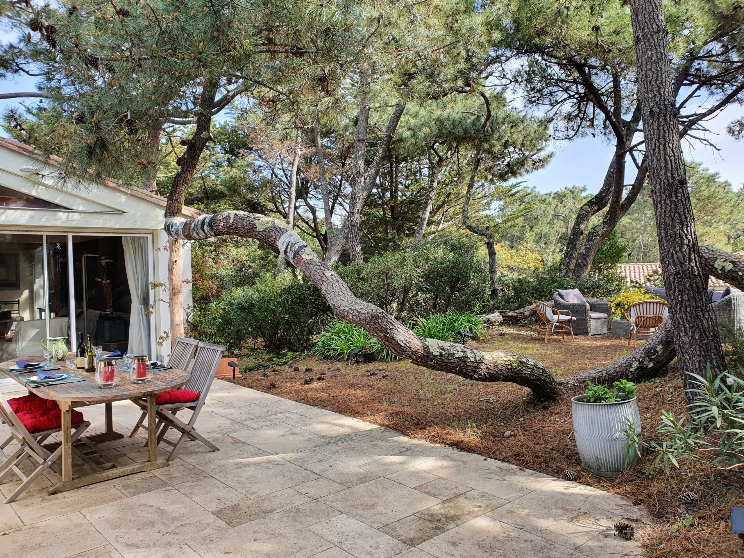 Cuisine entièrement équipée ouverte sur la pinède : réfrigérateur, four, micro-ondes, plaques de cuisson, lave-vaisselle, lave-linge, double évier, vaisselle complète et nombreux équipements (cafetière, grille-pain, robot). Tout est pensé pour cuisiner facilement au quotidien.