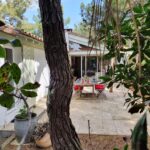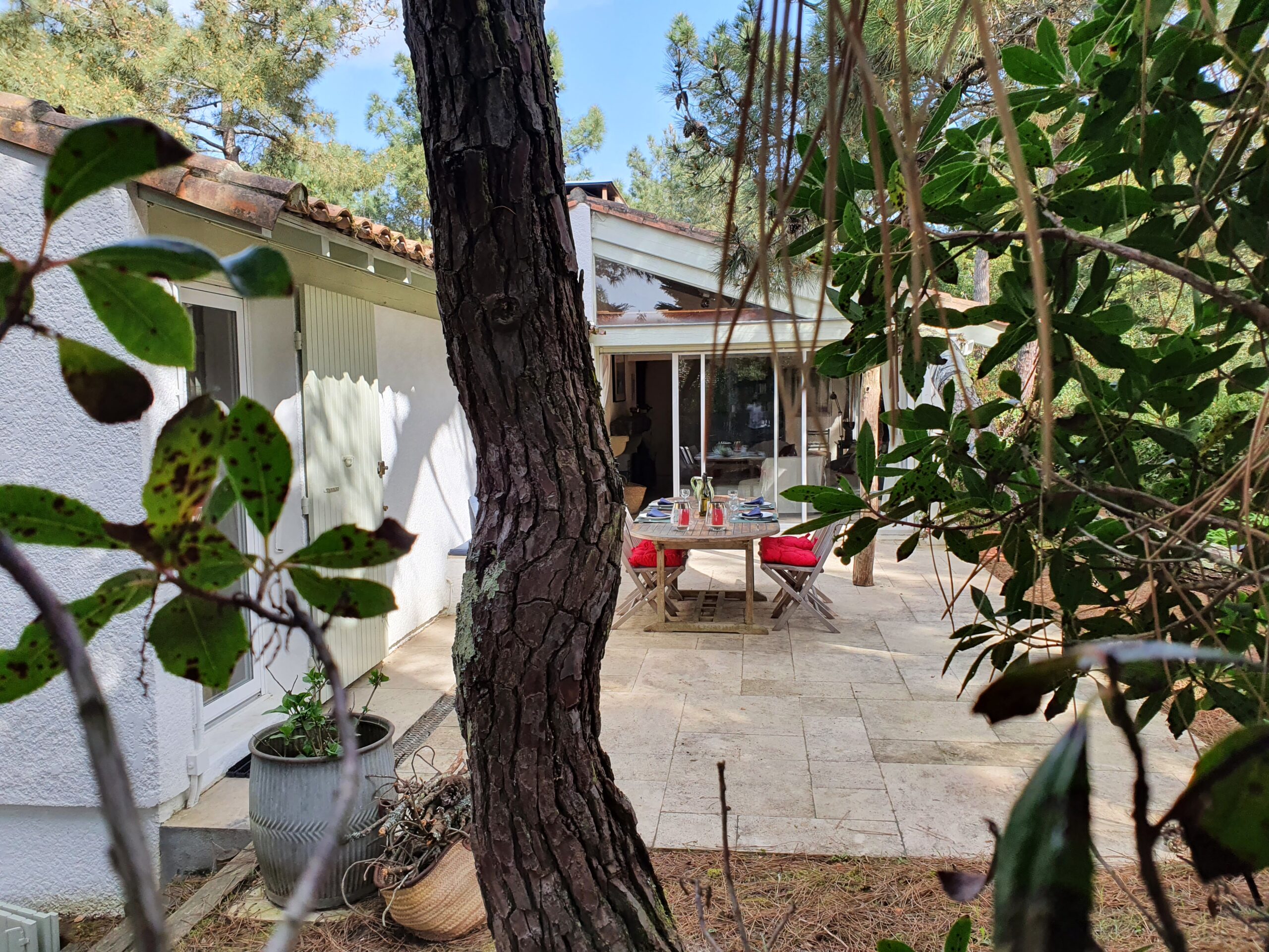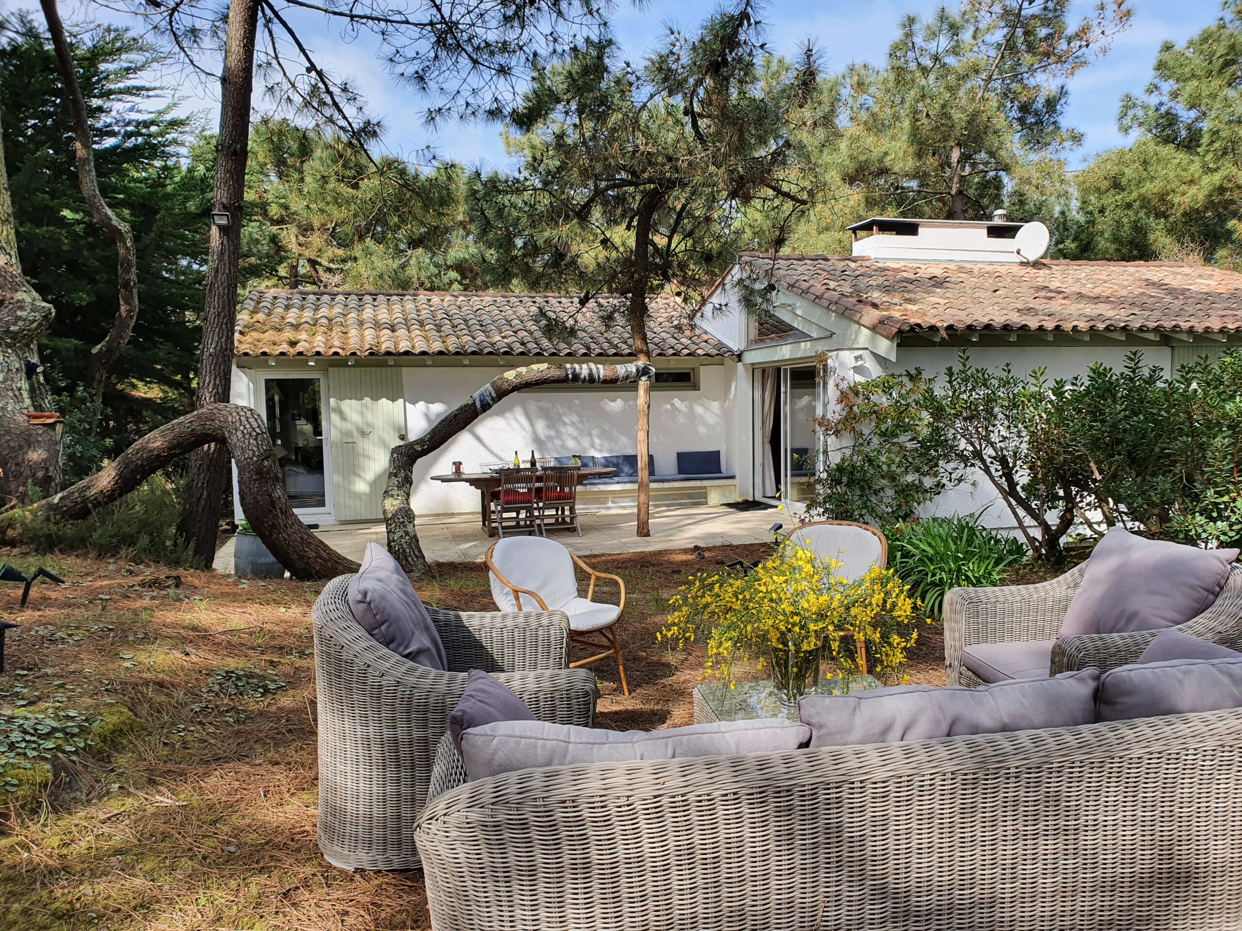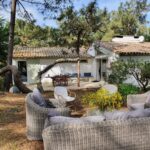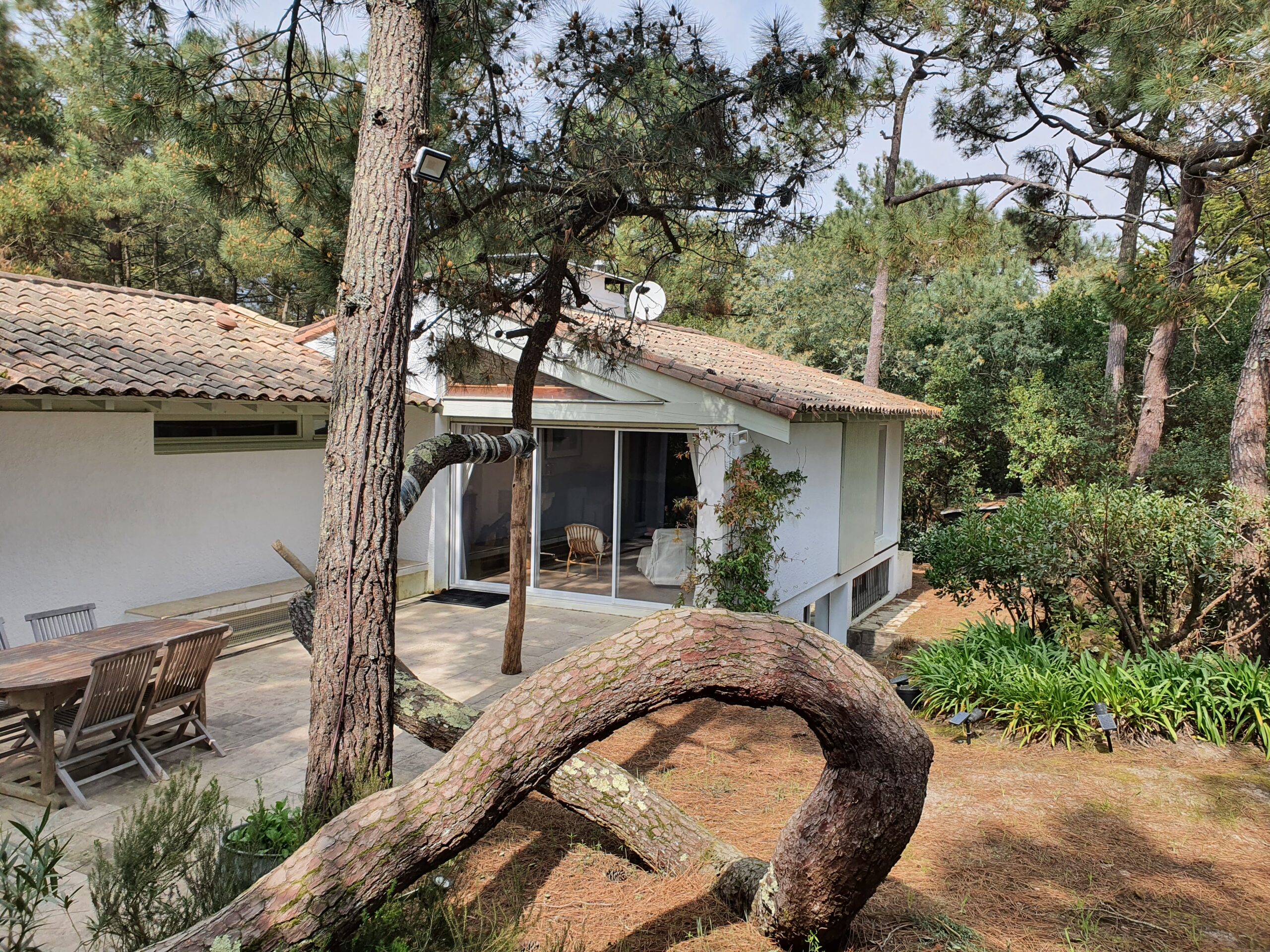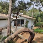 Implantée sur un terrain de 1 200 m², la maison est entourée d’un jardin naturel en pinède, typique du Cap Ferret, où de magnifiques pins sculptés par les vents créent une atmosphère unique, sublimée le soir par un éclairage discret. La terrasse, accessible depuis le séjour et la chambre principale, prolonge les espaces de vie avec une grande table et des chaises en teck, une banquette confortable, une douche extérieure et un étendoir. Parking privé pour deux voitures dans la propriété.