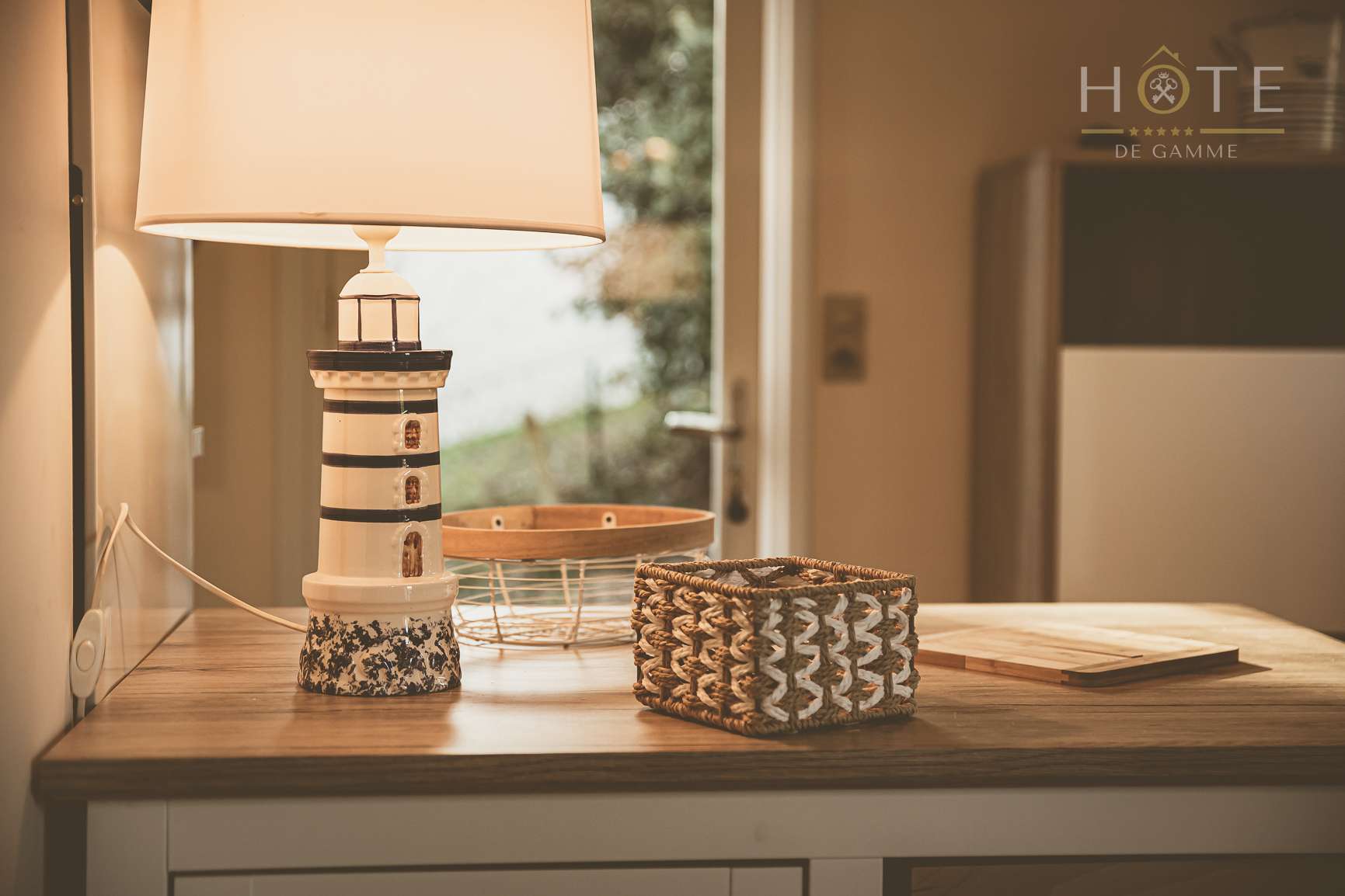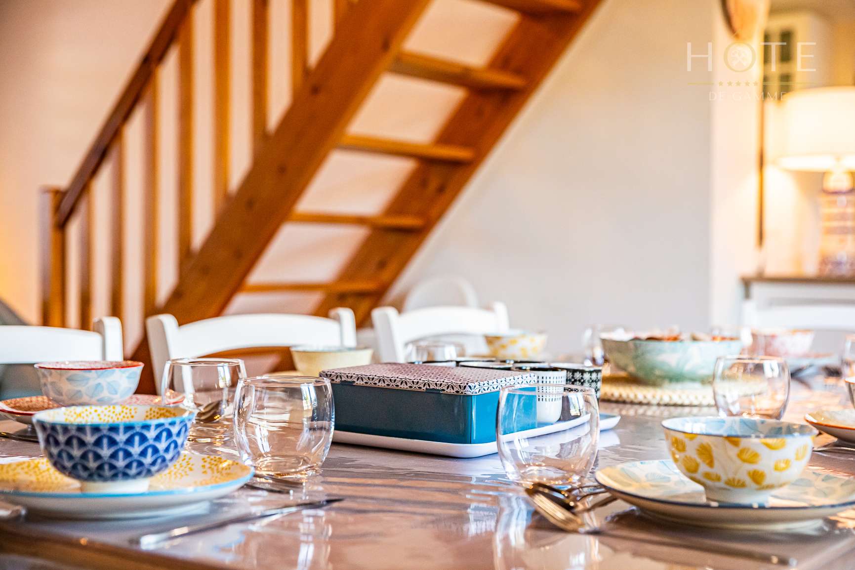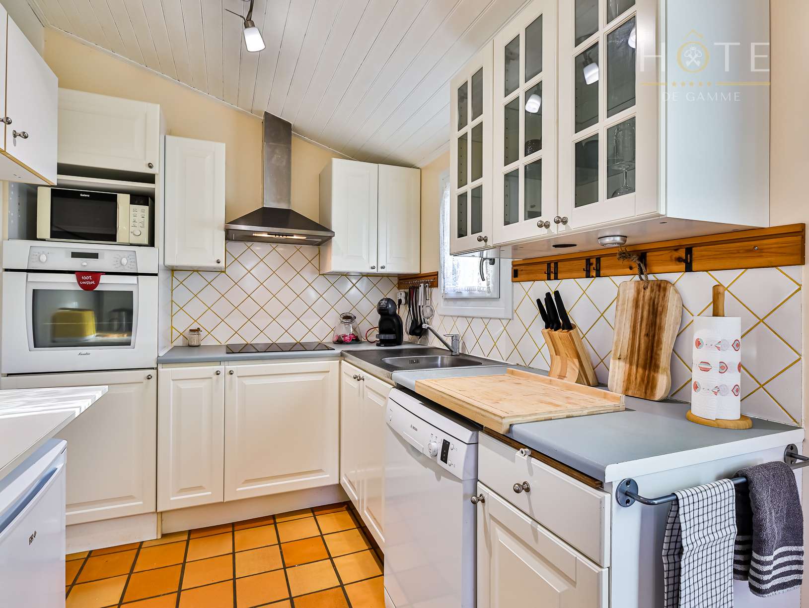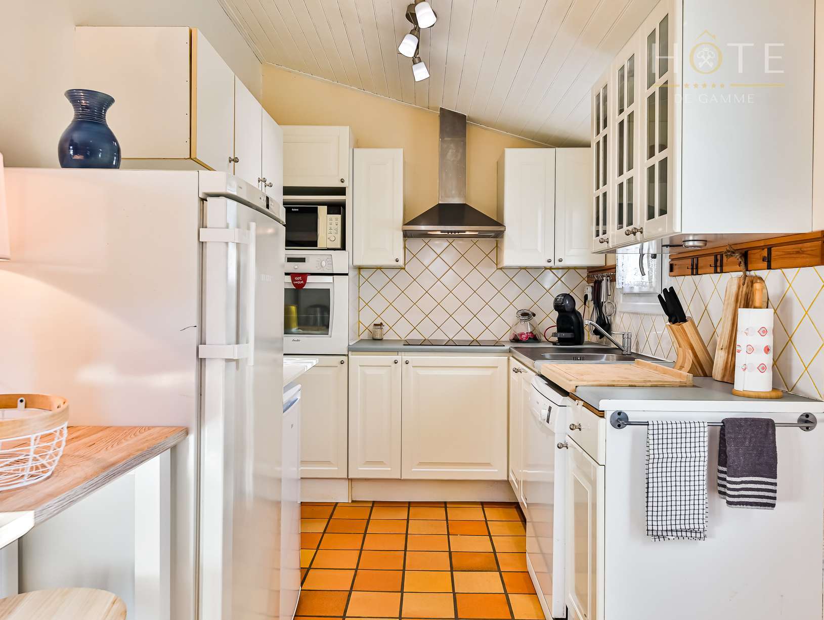 Une cuisine ouverte et entièrement équipée s’ouvrant sur le séjour, incluant micro-ondes, lave-vaisselle, cafetière, bouilloire, plaques à induction, ainsi que tous les ustensiles et condiments nécessaires