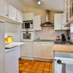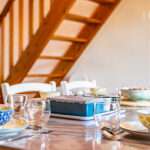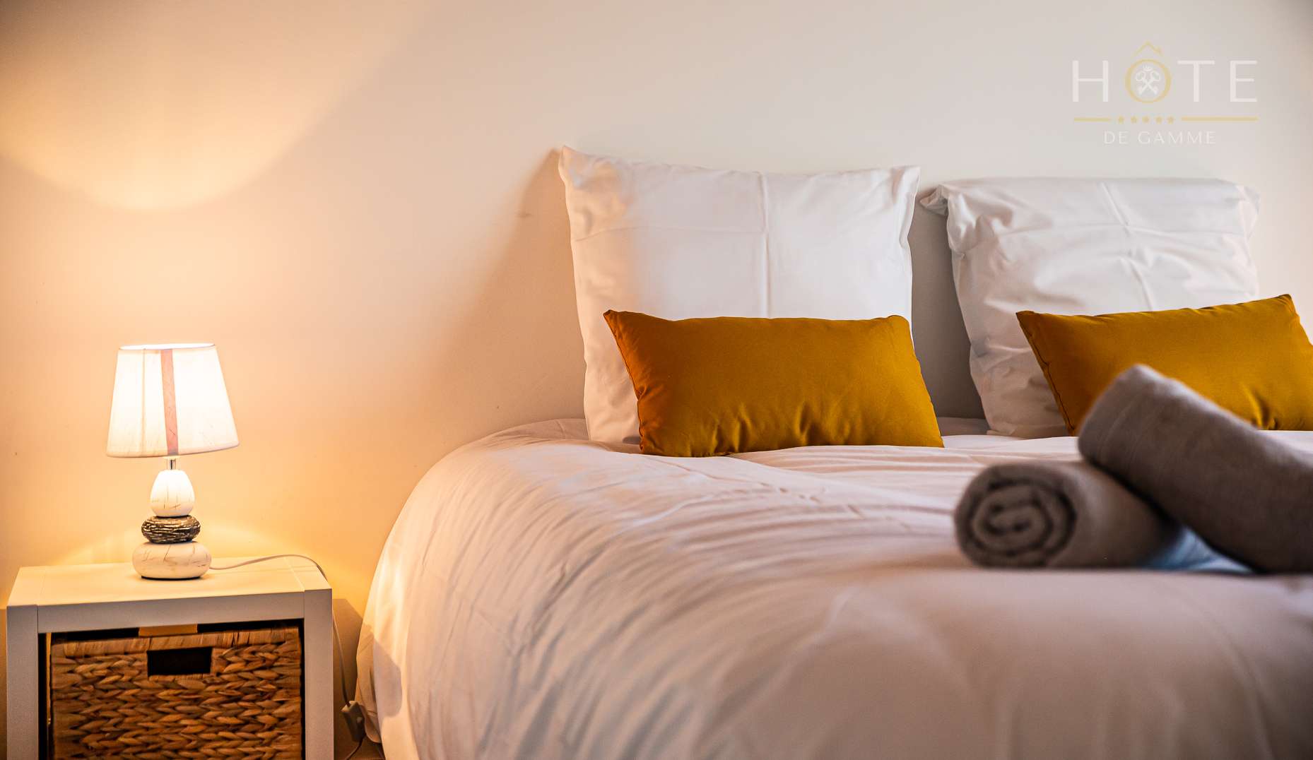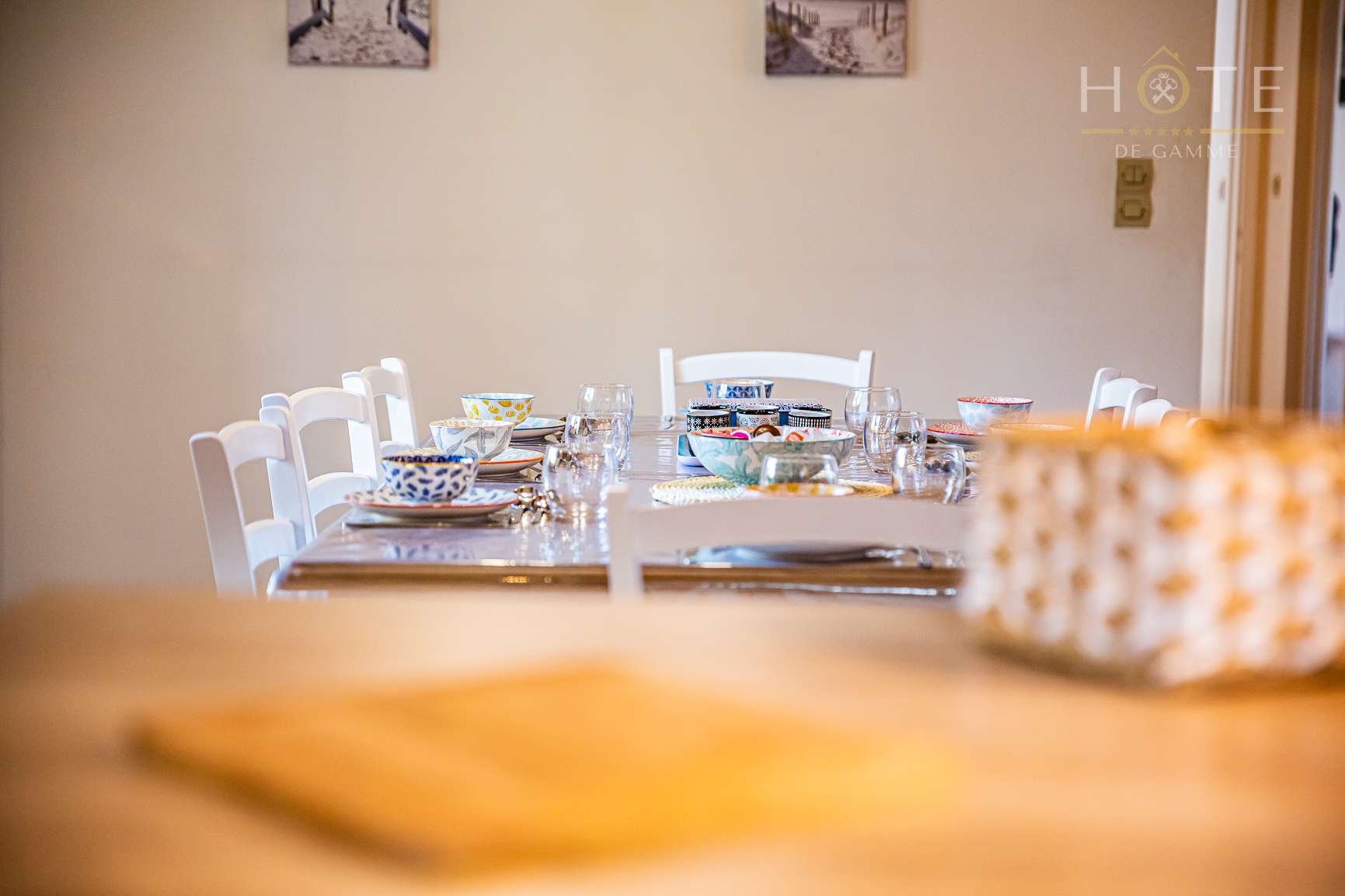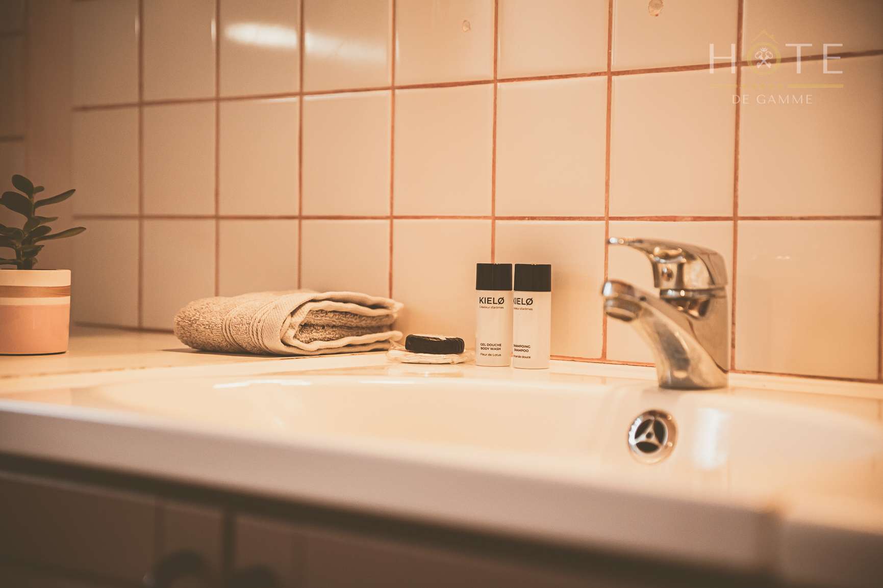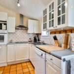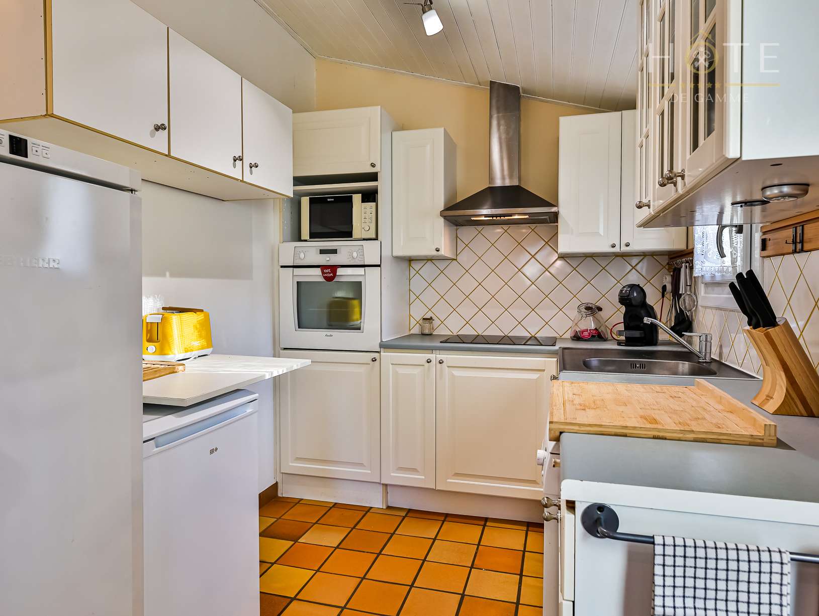 Une cuisine ouverte et entièrement équipée s’ouvrant sur le séjour, incluant micro-ondes, lave-vaisselle, cafetière, bouilloire, plaques à induction, ainsi que tous les ustensiles et condiments nécessaires