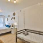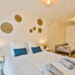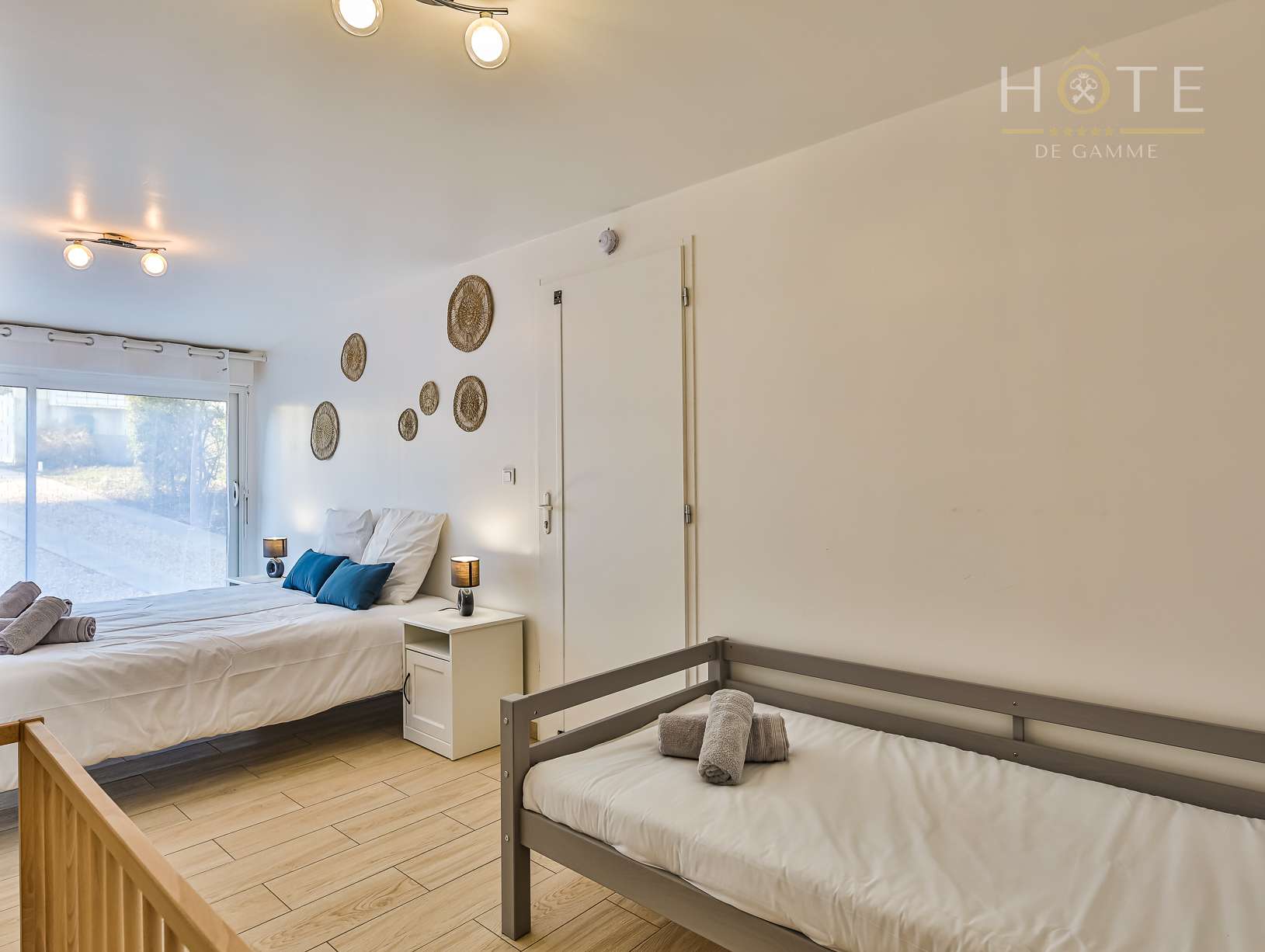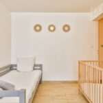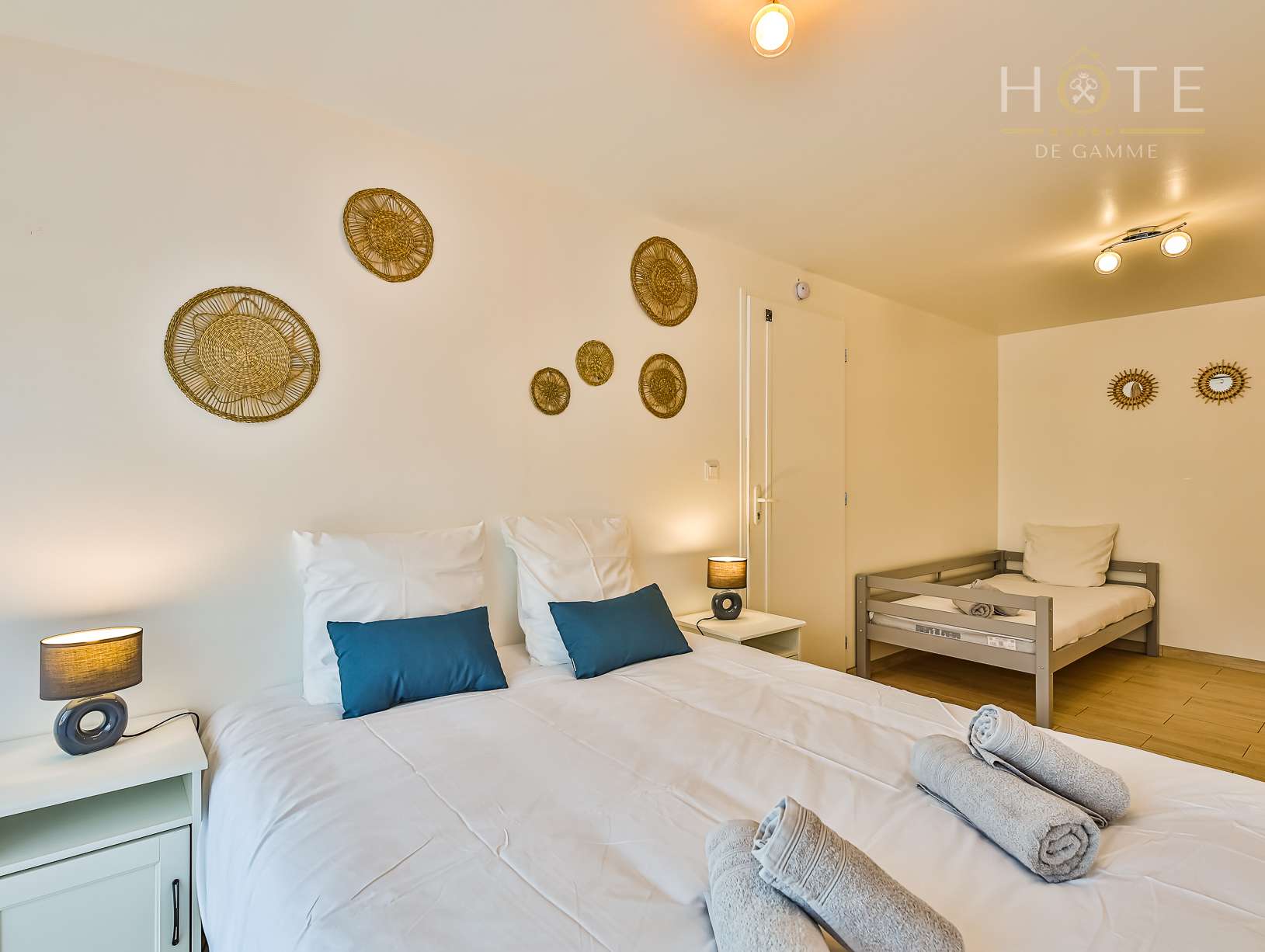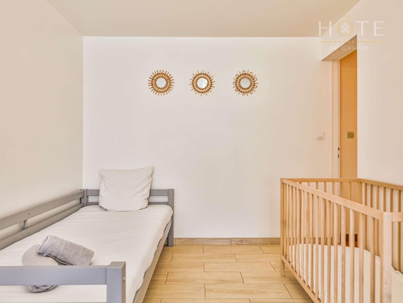 Une deuxième chambre avec un lit double, un lit simple et un lit bébé