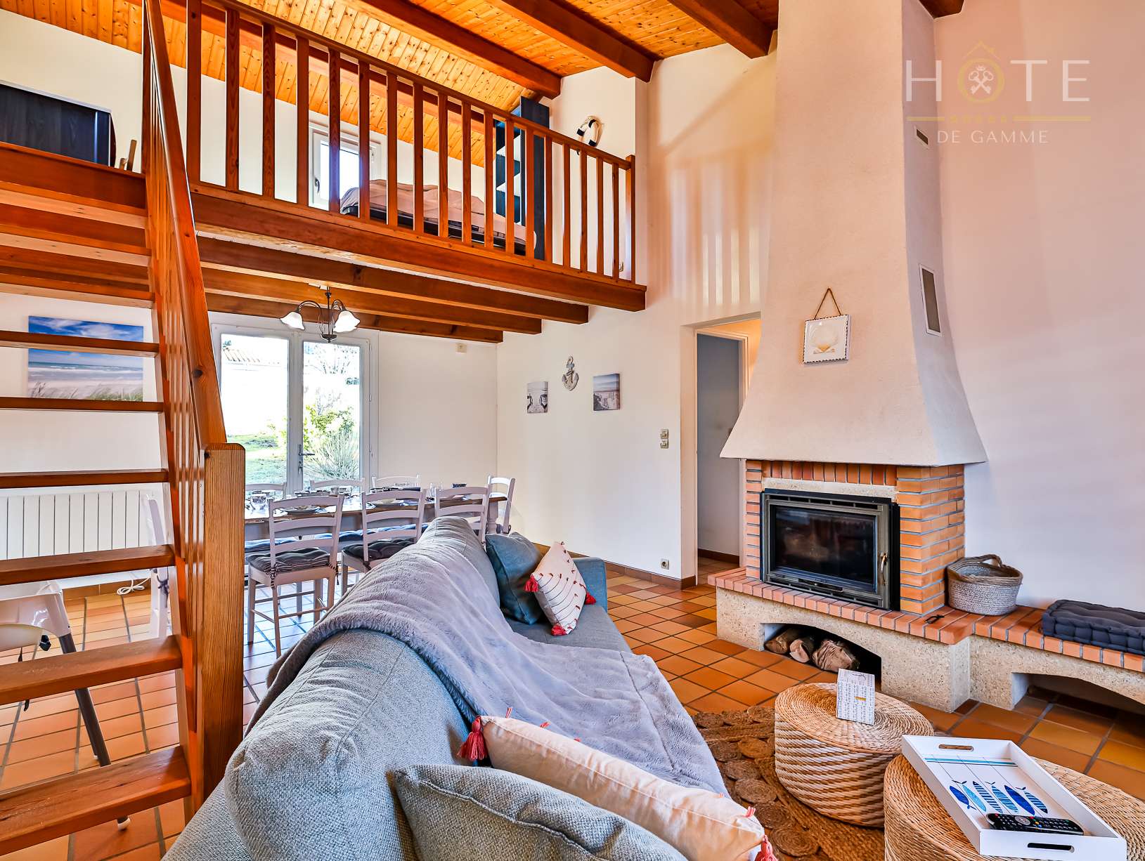 Un vaste séjour avec un insert, ouvrant sur une mezzanine lumineuse