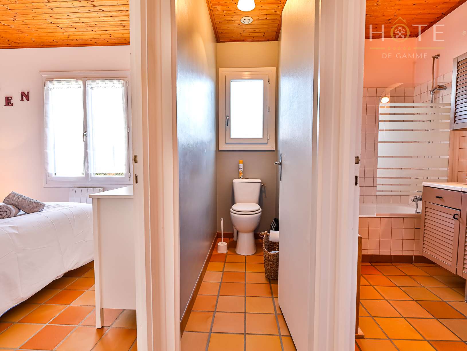 Une salle d’eau avec vasque, lave-linge et meubles de rangement, ainsi qu’une toilette complètent l’étage.