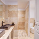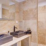 * Une salle d’eau avec double vasque, WC et une grande douche
