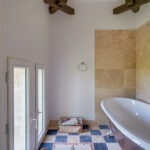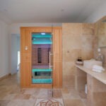 * Une salle de bain avec double vasque, WC, une grande douche, un sauna 2 personnes et une baignoire avec vue sur les vignes