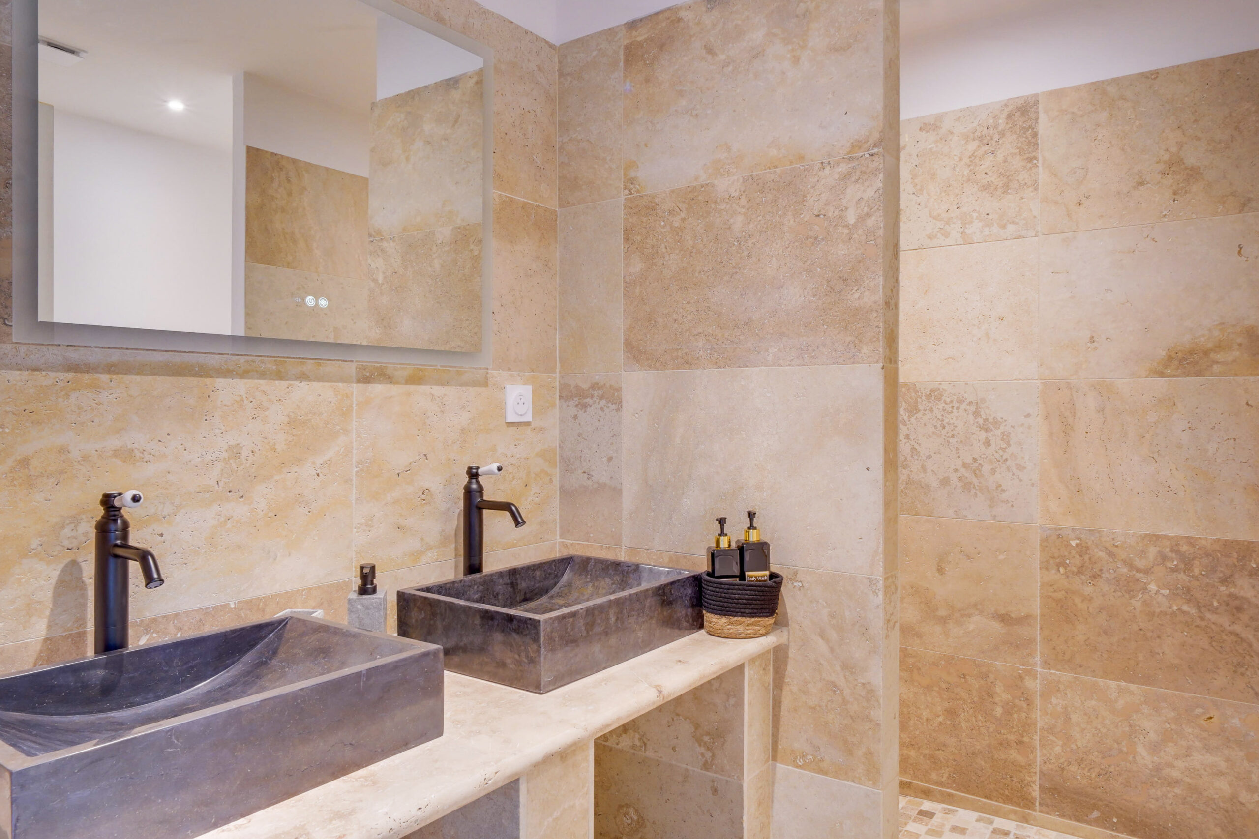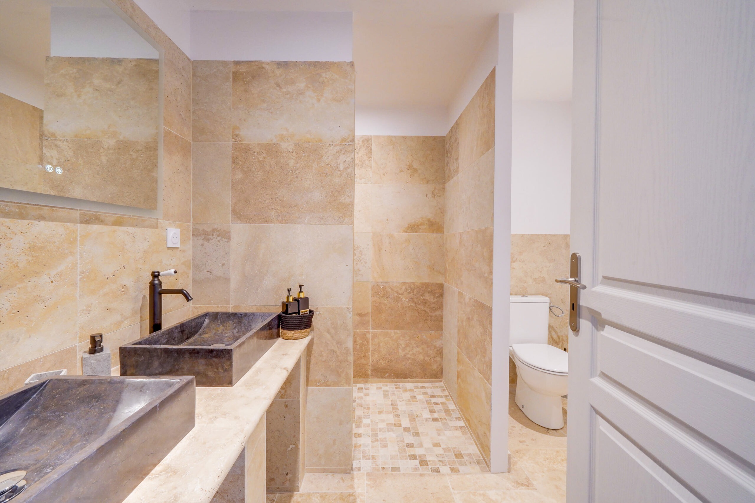 * Une salle d’eau avec double vasque, WC et une grande douche