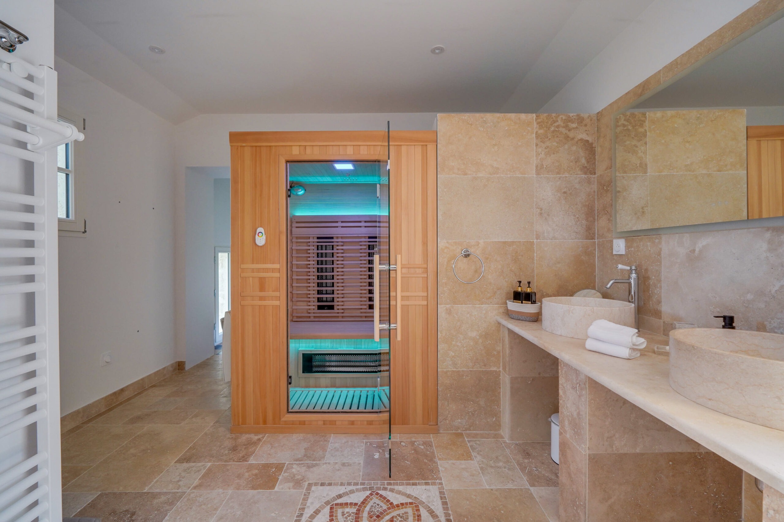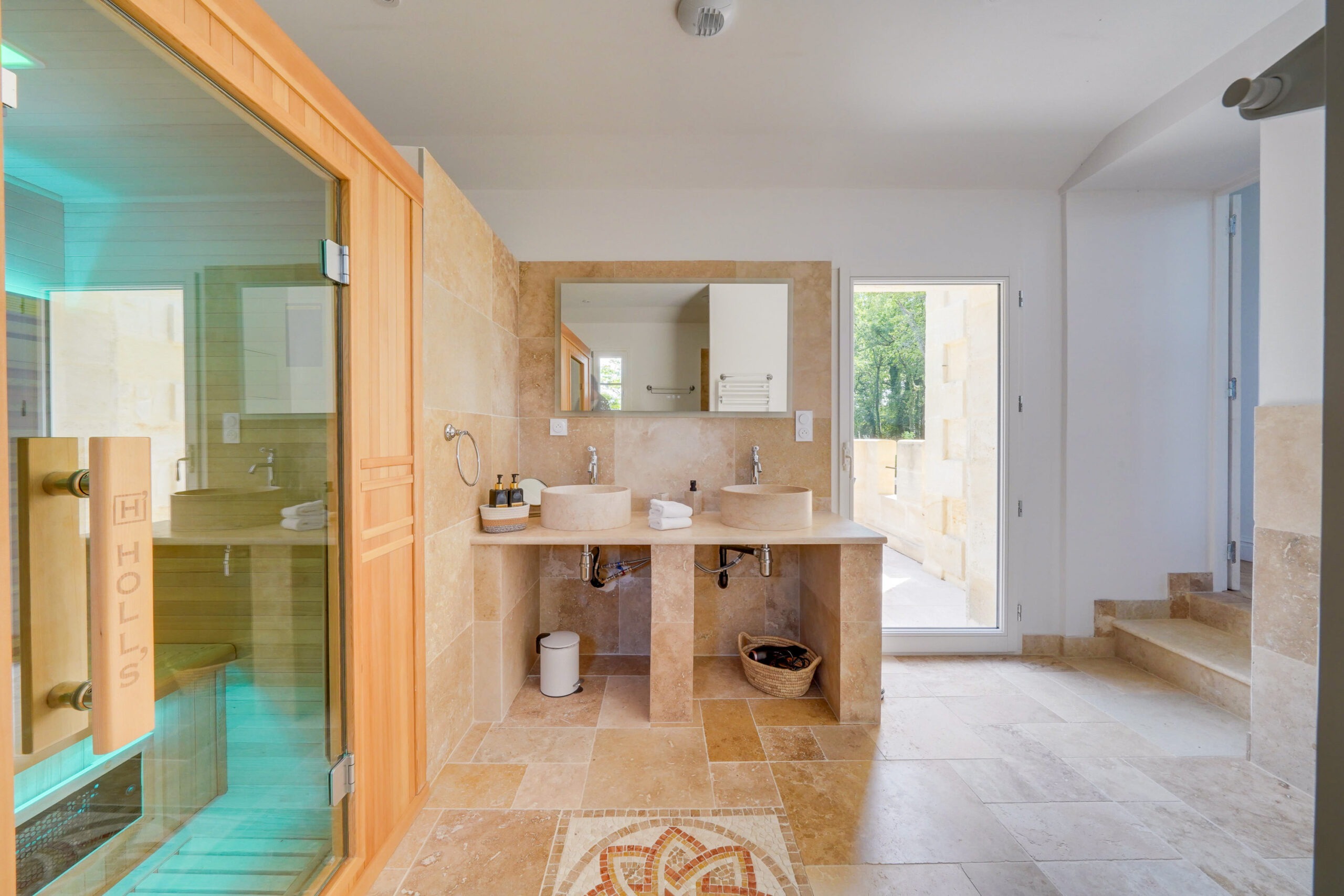 * Une salle de bain avec double vasque, WC, une grande douche, un sauna 2 personnes et une baignoire avec vue sur les vignes
