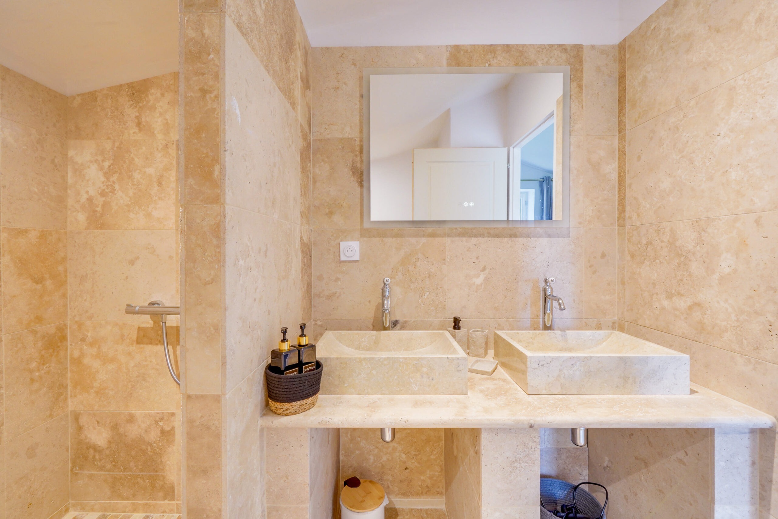 * Une salle d’eau avec double vasque, WC et une grande douche.