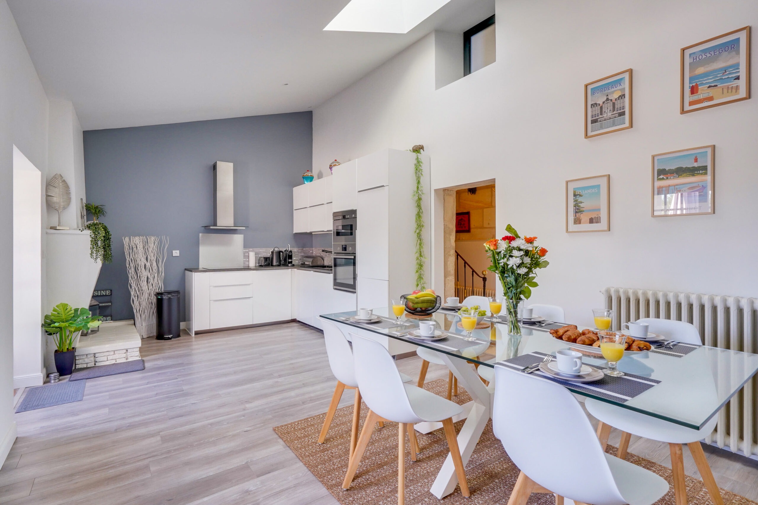 * Une grande cuisine ouverte sur la salle à manger, entièrement équipée (four, réfrigérateur, micro-ondes, lave-vaisselle, machine à café, bouilloire, plaque de cuisson, tous les ustensiles nécessaires).